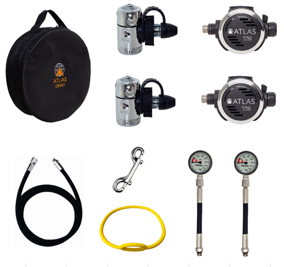 O Kit Atlas SD é um conjunto completo para a prática do mergulho Sidemount, utilizando a configuração padrão com 2 reguladores (um com mangueira de 70 cm e outro com mangueira de 150cm) e 2 manômetros de mangueira curta. Acompanham também uma bolsa de transporte, uma gargantilha e um mosquetão duplo. Nesta versão utilizamos regulador de diafragma balanceado.